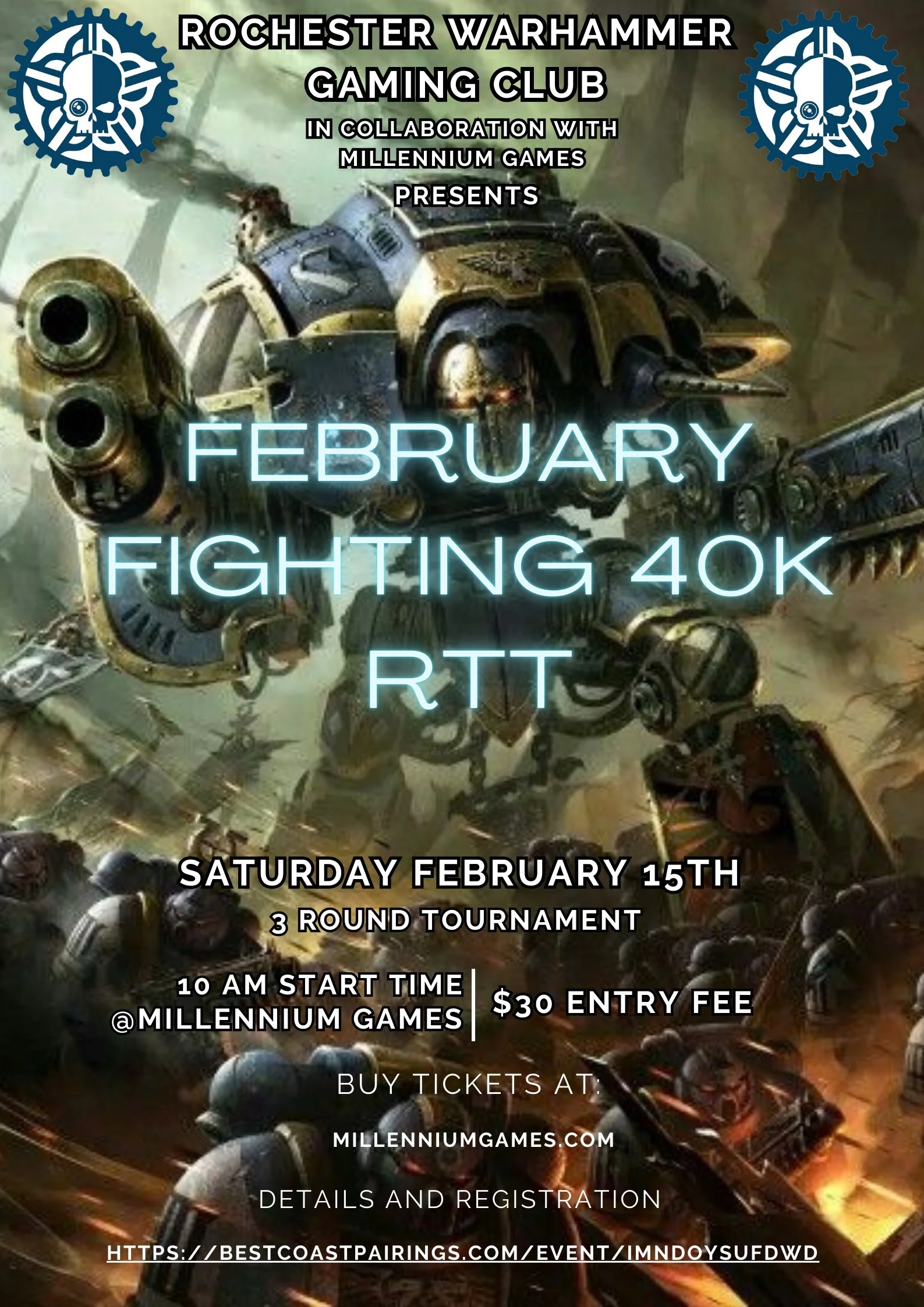 The Rochester War Gamers Club in association with Millennium Games is happy to host February Fighting, Warhammer 40k RTT event using the Pariah Nexus Tournament Rules. The event will consist of three 3-hour rounds, with prizes for first, second and third. Lunch will be provided by Millennium Games at the event.